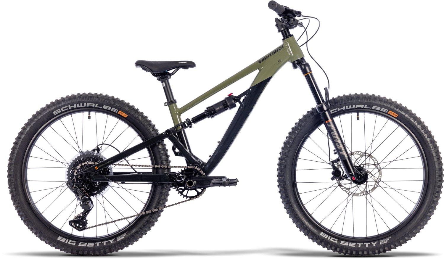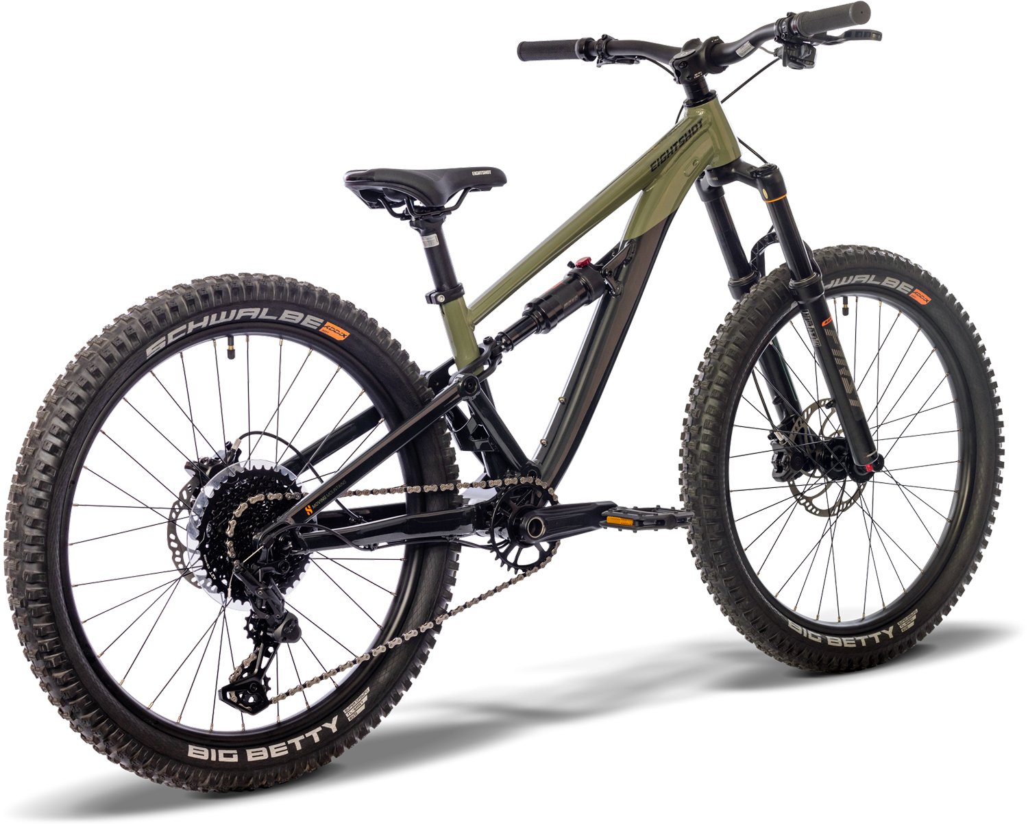 Eightshot GROOT 246 (woodland) – Il primo mostro full-suspension di EIGHTSHOT! È arrivata la bici definitiva per i giovani shredder. Il telaio in tubi idroformati AL 6061-T6 con escursione posteriore di 120 mm è super robusto e leggero. Con il BSA 73, l’asse passante 142 x 12 e il passaggio interno dei cavi, la bici ha un aspetto pulito e prestazioni da professionista. E soprattutto: è possibile convertire le ruote da 24 a 26 pollici!